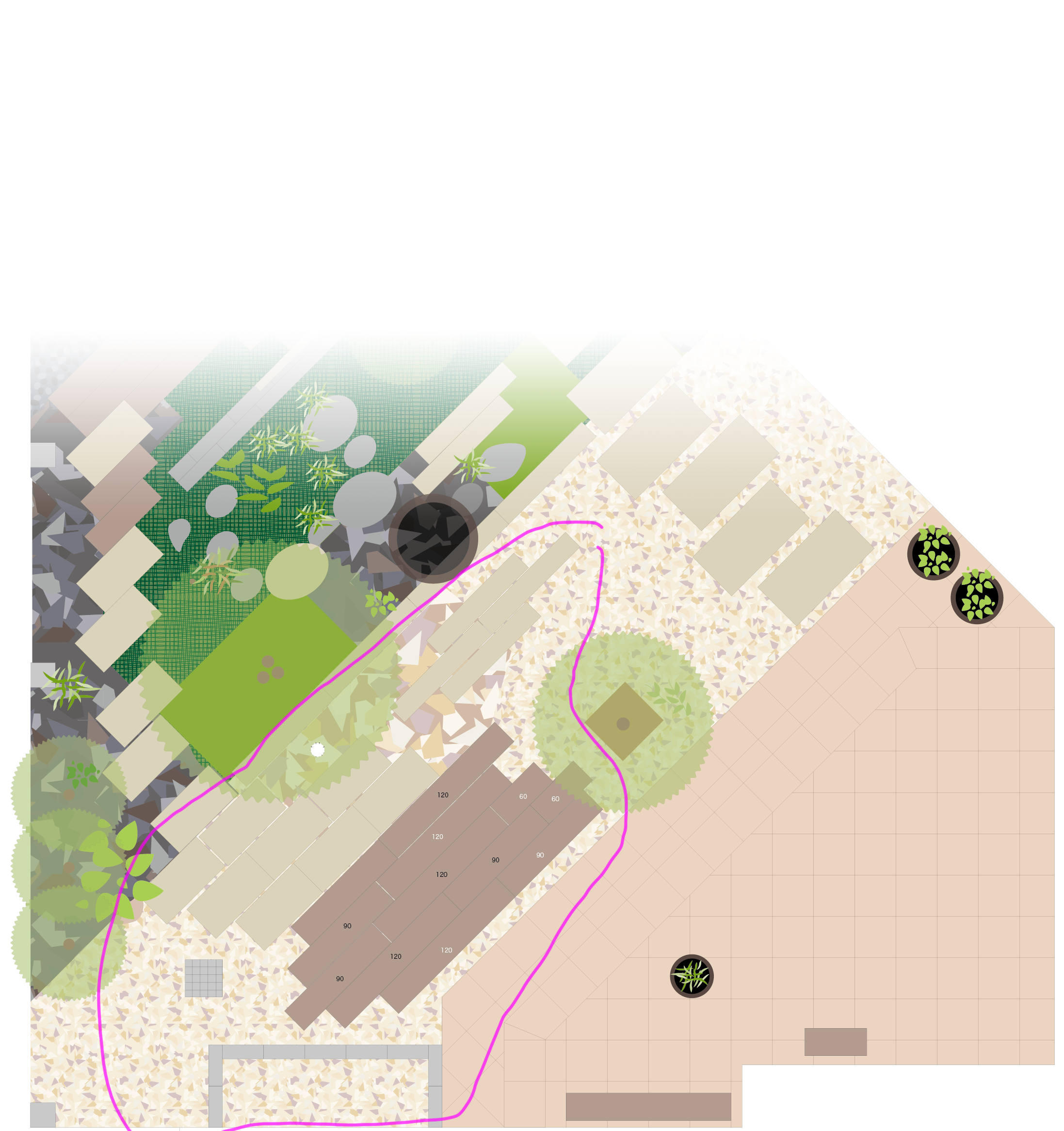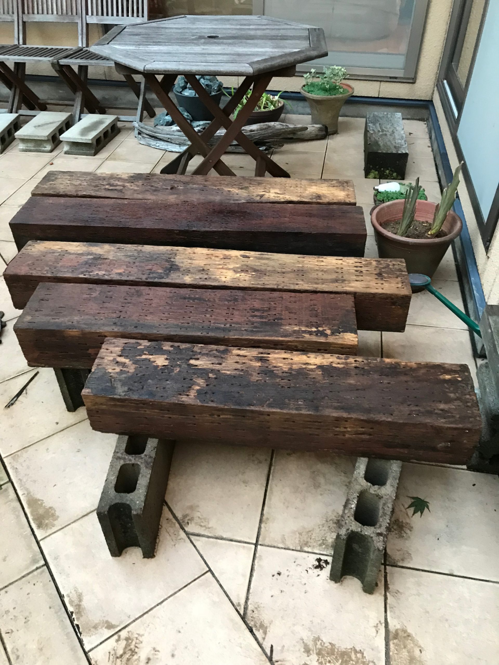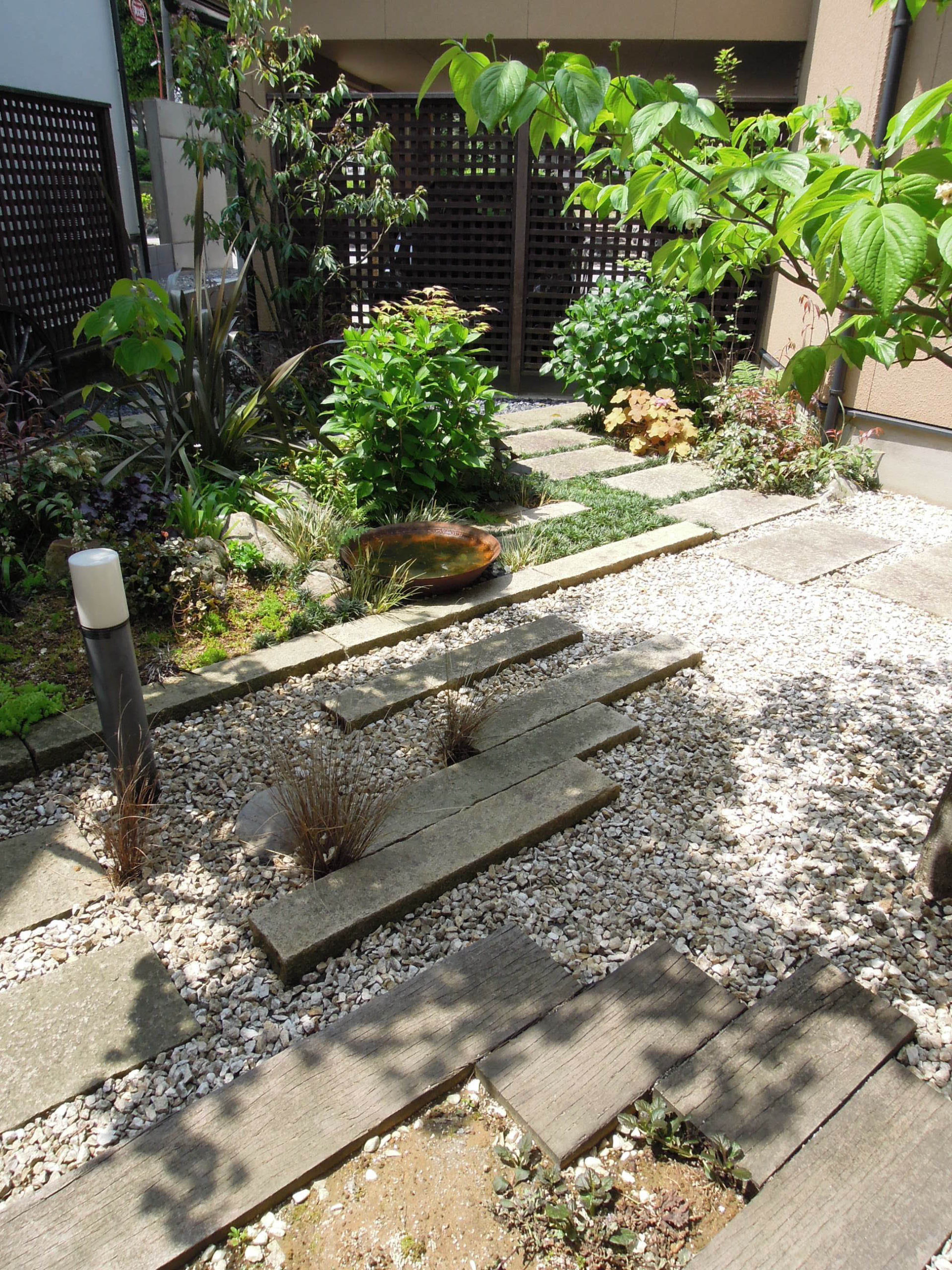 庭工事2019[02]御影敷石・枕木の移動 その1 2019.10.14 前回からの続き。10年以上前に書いた図面を引っ張り出し、リフォームする箇所を書き直してみた。 現状(10年ほど前の図面) 水色で記した部分の水捌けが悪く、枕木が朽ち始めていた。排水溝に合わせて妙なピッチで並べた御影敷石の上も少し歩きにくい…。 今回の修正計画 一部枕木を撤去して、敷石も含めて並べ替えることにする。空いた箇所には花壇でも作られば良いのだが。 では早速工事開始。 御影敷石の移動、重い…。 枕木をめくってみると…。 案の定、枕木デッキの中央部分に水が溜まるようになってしまっていた。(作業は雨の中…)こりゃ、腐ってしまうわけだな。 続く。